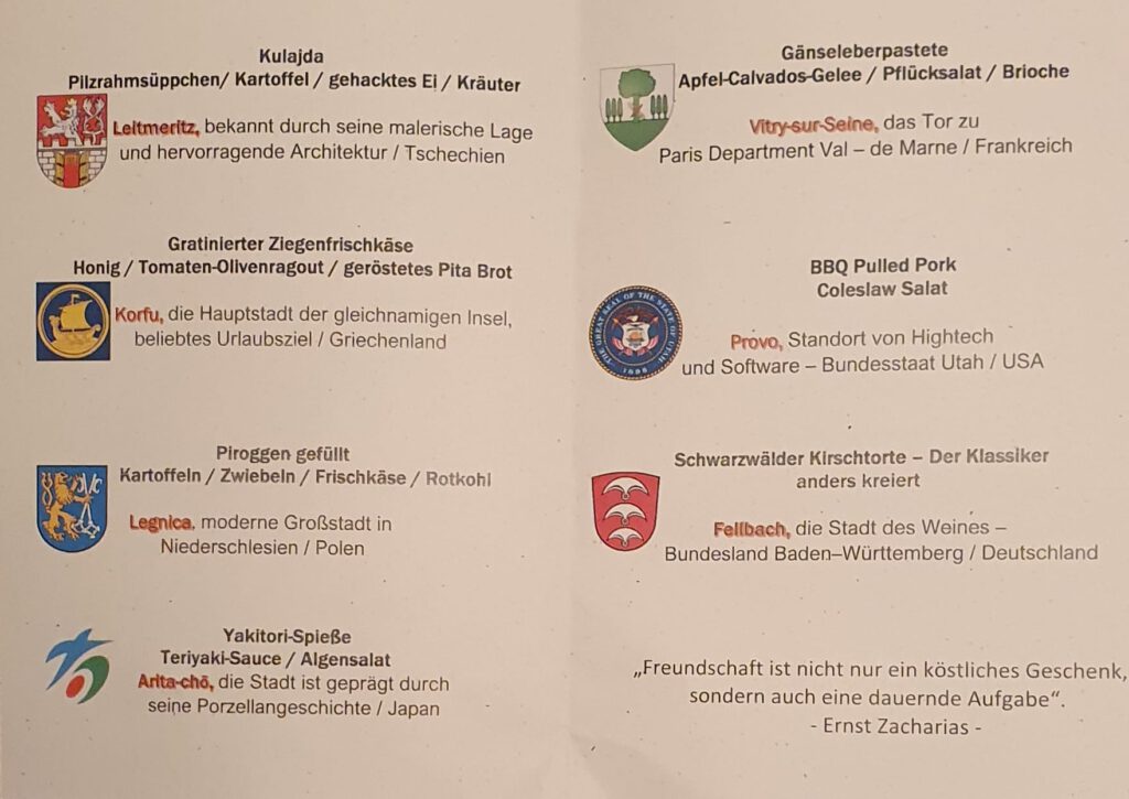 Es wurden gereicht: Kuljada für Litoměřice, gratinierter Ziegenfrischkäse mit Honig, Tomaten-Olivenragout und geröstetes Pita Brot für Korfu, Piroggen gefüllt mit Kartoffeln, Zwiebeln, Frischkäse und Rotkohl für Legnica, Yakitori-Spieße mit einer Teriyaki Sauce und Algensalat für Arita, Gänseleberpastete mit Apfel-Calvados-Gelee, Pflücksalat und Brioche für Vitry-sur-Seine, BBQ Pulled Pork und Coleslaw Salat für Provo und Schwarzwälder Kirschtorte anders kreiert für Fellbach.
